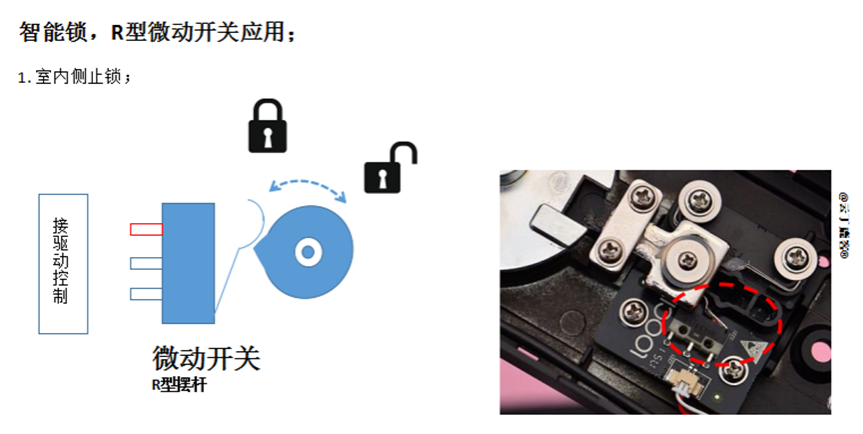 除了這種常規的微動開關,還有一種被稱為R型擺桿的微動開關也頻繁被用于智能鎖中。下圖是歐姆龍R型擺桿的微動開關,通常用于室內側,類似于反鎖的機制,但又區別于反鎖功能。該功能叫“室內側止鎖”, 用于防止屋內側的寵物或小孩,不經意觸到把手把鎖打開, 而此時大人或主人又不在室內, 繼而產生安全隱患。