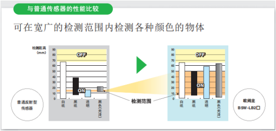 與普通傳感器的性能比較,歐姆龍可在寬廣的檢測范圍內檢測各種顏色物體
