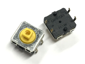 2、輕觸式開關——代表型號:歐姆龍B3W型輕觸開關,超小超薄,備有6mm方形、12mm方形2種,便于靜電對策的帶接地端子型也有。凸型頂塊上可以安裝鍵頂。